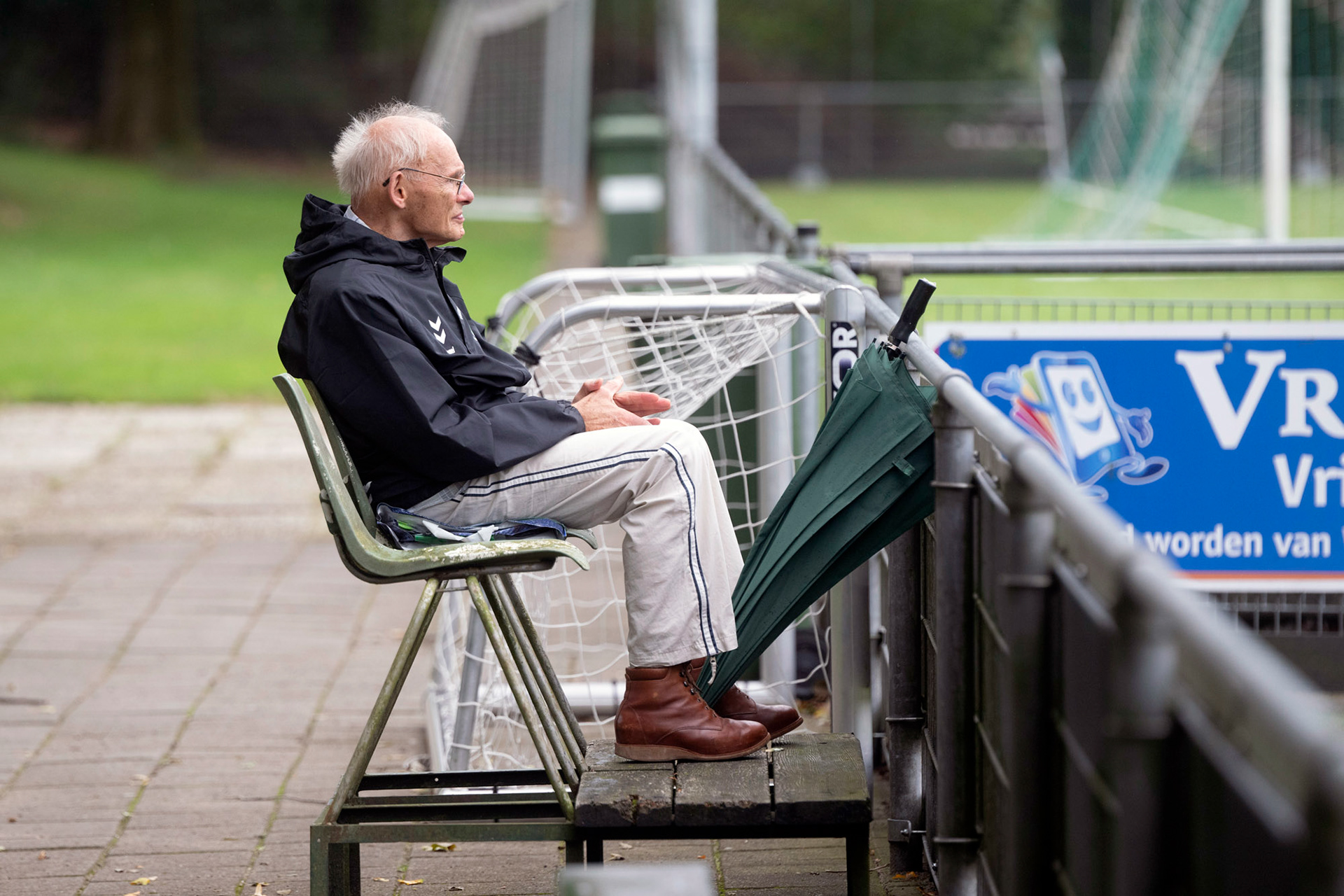 Supporter maakt prive tribune. Zo kan hij in elk geval voetbal kijken, anders zat hij toch maar thuis.